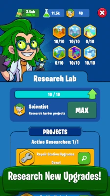 Manage your research lab to research permanent upgrades to your garage. Through the power of science become the ultimate garage empire tycoon!