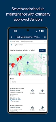 • Find gas stations and maintenance vendors. Schedule service for repairs.