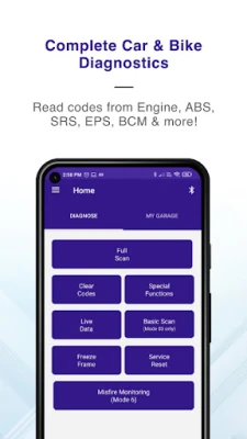 GaragePro offers you 200+ diagnostics functions in cars, bikes and heavy vehicles and can be used with any common OBD2 scanner like ELM327 scanners and others.