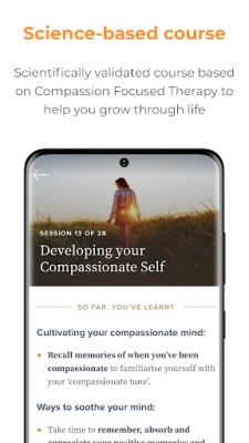 With evidence based ideas and exercises from CFT, this app will teach you how to cultivate compassion for yourself and others. Through the course, you’ll learn how to strike a balance between self improvement & self acceptance: teaching you how to have a realistic but kind view of difficulties that arise in life, and giving you the confidence you need to achieve your goals in life, work and relationships.